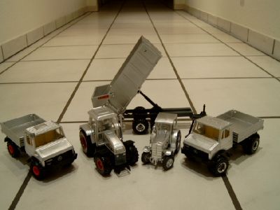 Die neueste Serie Unimog 1700 einmal mit Terras und verchromten Felgen einmal normale Felgen Fendt 309 CI Hanomag und Kaweco Kipper