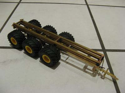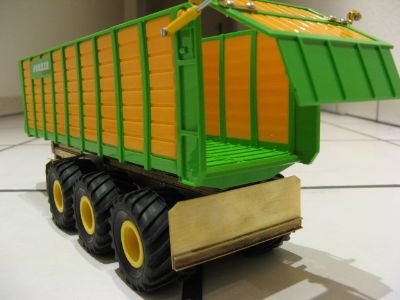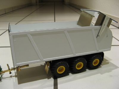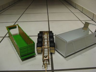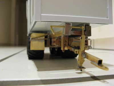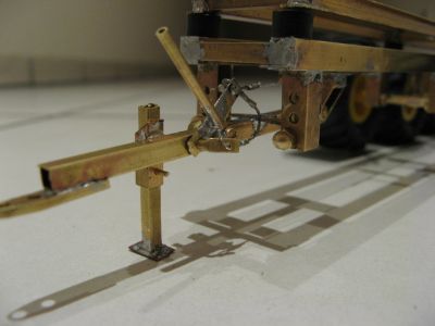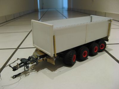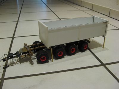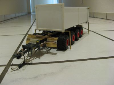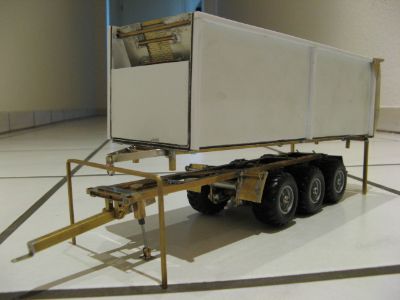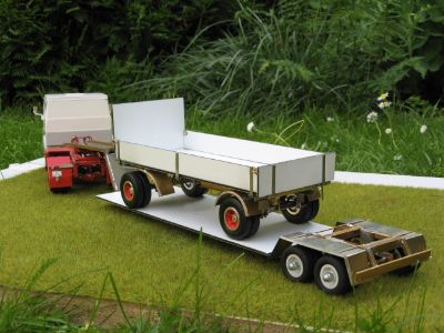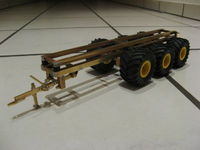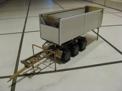 Neuer Anhänger aus Messing mit Parabelfedern und ausgleich zwischen den Achsen sowie Liftachse gefederter Deichsel, Stützfuß so wie Kipperfunktion des Aufbaus. Auslegung als Cargo mit verschiedenen Wechselaufbauten.