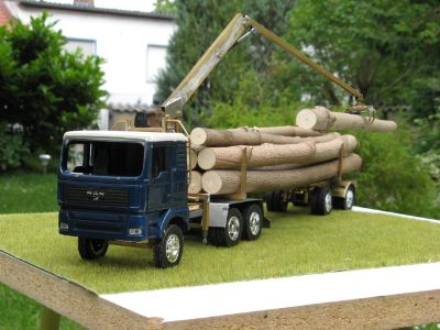 MAN Holz Transporter mit Anhänger und gerade beim Holz laden.