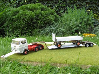 Das neue Gespann Henschel F221 mit Tieflader von Goldhofer so wie der Kässbohrer Anhänger als Ladegut.